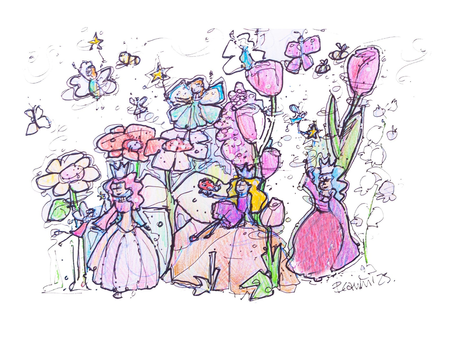 Illustrée par Brigitte Cantin, cette pièce met en scène une petite princesse émerveillée parmi des tulipes géantes, des papillons curieux et un souffle de fantaisie qui rappelle les dessins d’enfance… mais revisités avec une sensibilité d’artiste adulte.